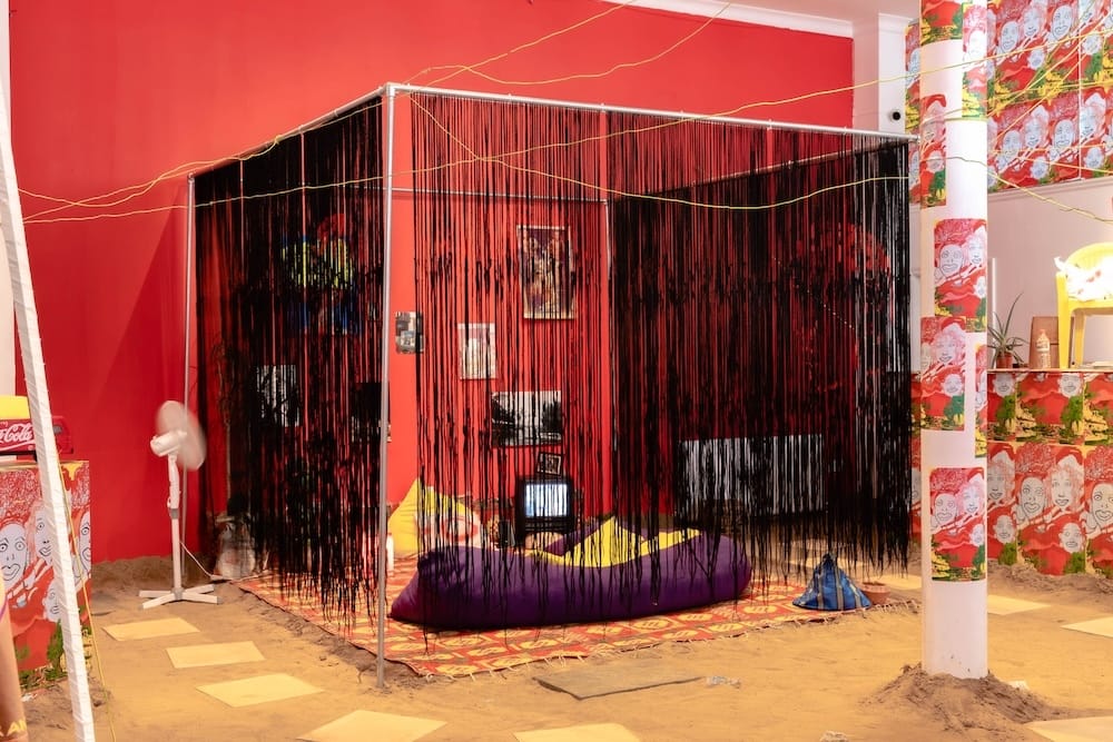 Roxane Mbanga, “NOIRES, la coiffeuse (hair salon),” 2022, Immersive installation, 200 x 200 cm. Courtesy of the Artist and 193 Gallery.